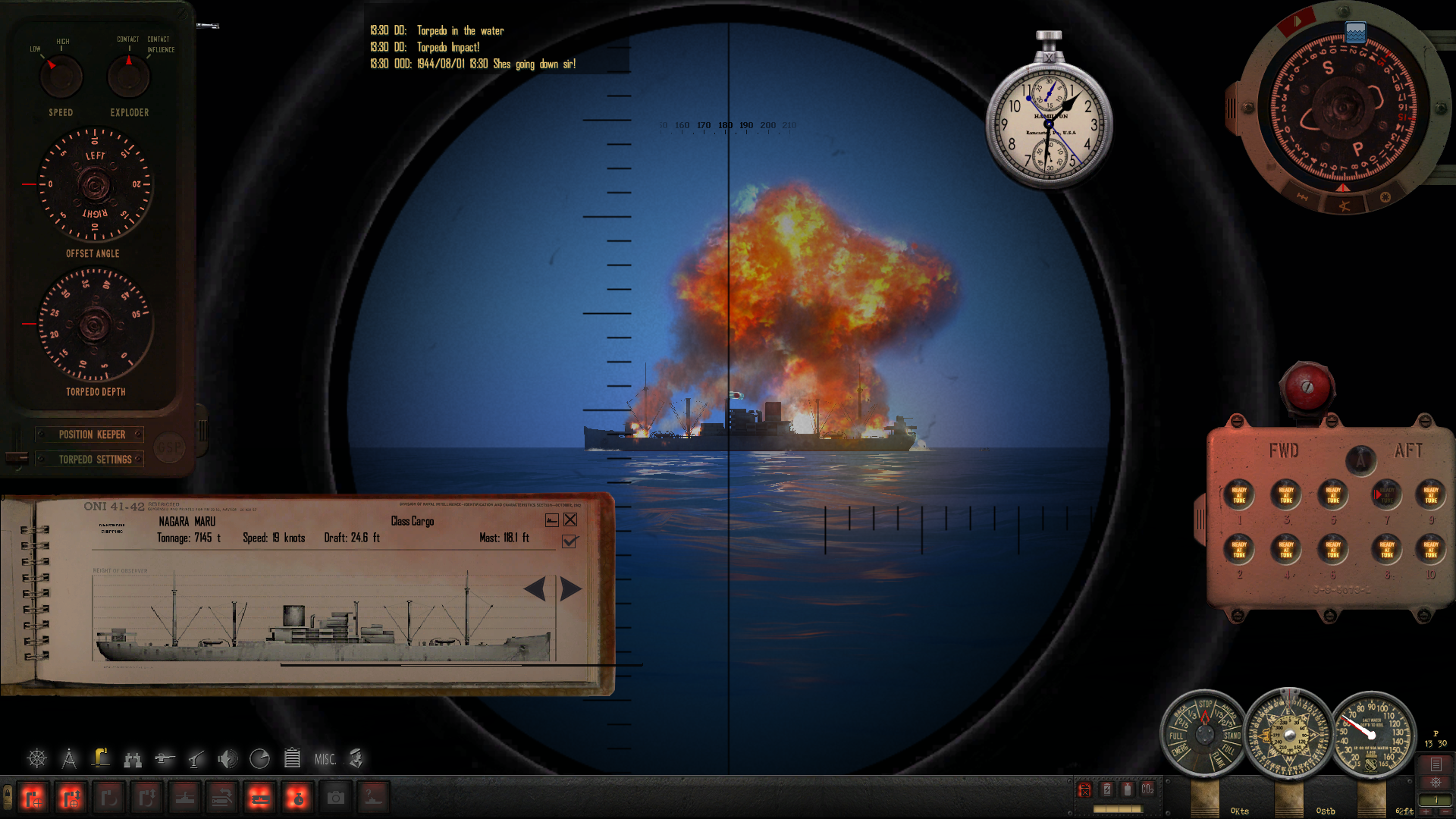 Dwa celne strzały w rufę nie zatrzymują go - cel zaczyna uciekać. Ścigam go po powierzchni przy 5 metrowych falach, lecz po kilku minutach ku mojemu zadowoleniu cel zatrzymuje się. Kolejny strzał... i pudło. Strzelam znowu z poprawką prędkości - torpeda w celu. Strzelam ostatnią torpedą i Nagara Maru idzie w końcu na dno.