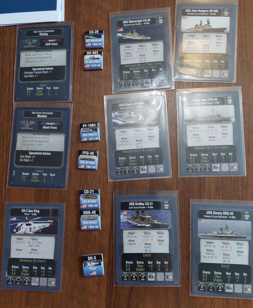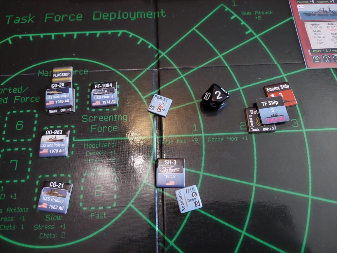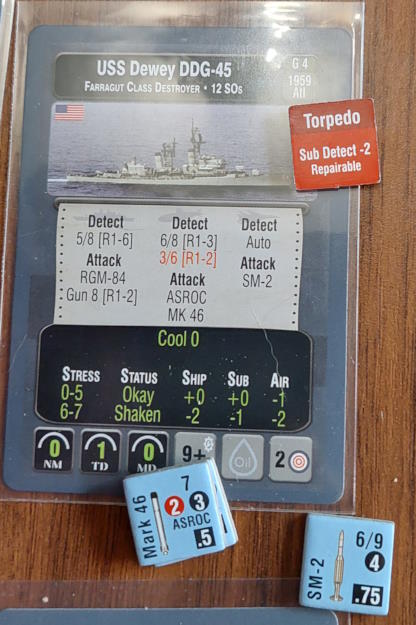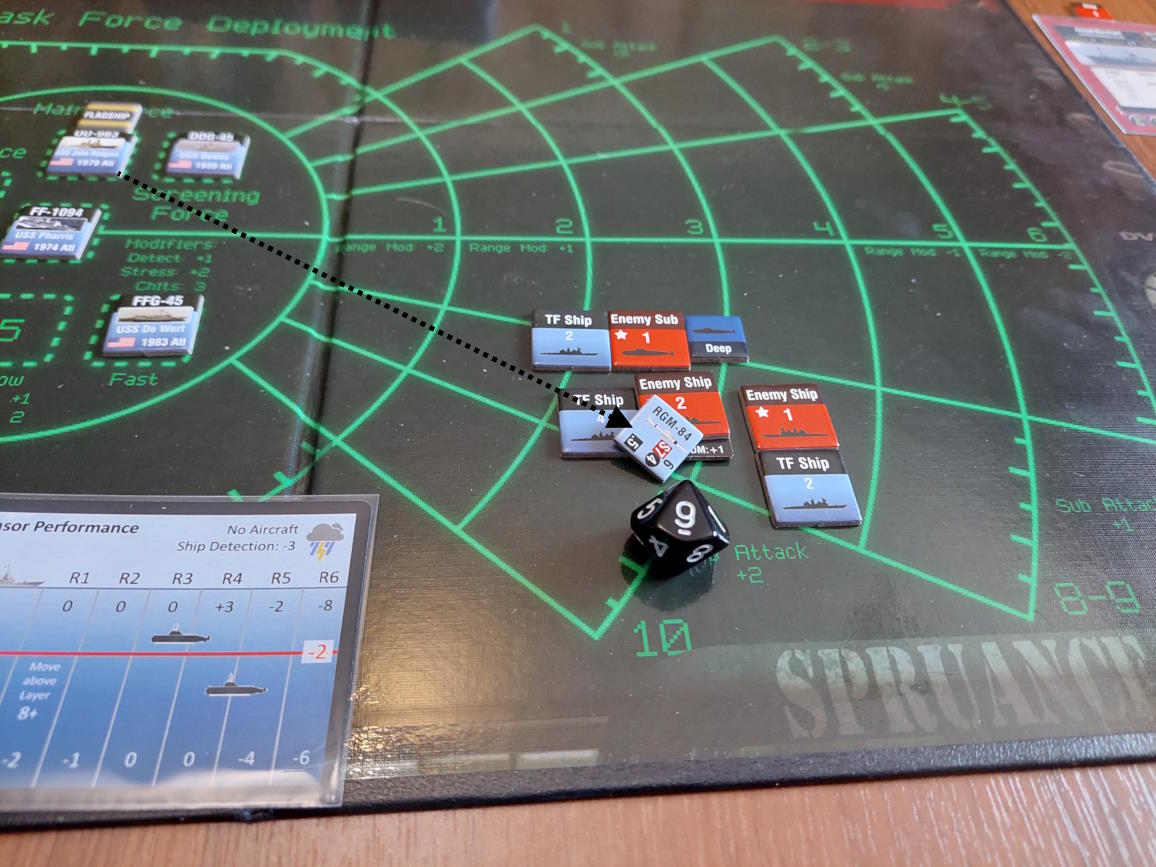 O 16:43 mój okręt flagowy stał się celem ataku. Ostatni Rosyjski okręt, rozpoznany potem jako Severomorsk przeprowadził atak na USS Wainwright, CG-28, uzyskując dwa trafienia. Uszkodzony został system kierowania ogniem, a druga z rakiet SS-N-14 Silex (prawdopodobnie) trafiła okręt w pobliżu wyrzutni rakietorped. To już nie były stateczki, teraz naszym przeciwnikiem byli prawdziwi sowieccy marynarze... Literówka na żetonie. Mój okręt otrzymał -2 do pociągania