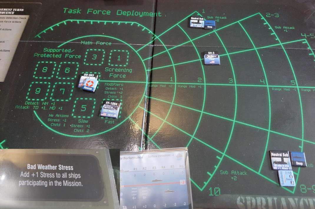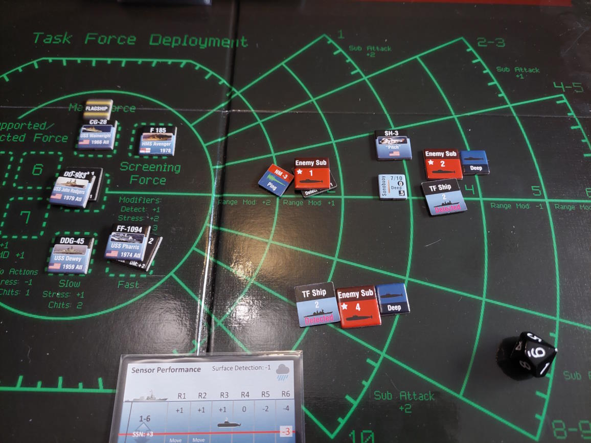 ... gdy nawiązano kontakt z wrogim zespołem. Akcje szybkie dowódcy: 1 - zbliżenie, rzut na chorobę udany, akcje okrętów szybkie (osłona) - rozpoznanie celu -> Uzyskano kontakt z nierozpoznaną jednostką [pogoda uniemożliwia osiągnięcie pełnej identyfikacji kontaktu. Przy 1k10 kara za pogodę wynosi 3, a rozpoznanie wymagałoby wyniku 9, przy najlepszej załodze mogącej dodać +1 do rzutu