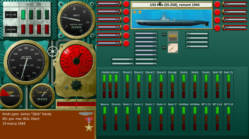 - No właśnie, poruczniku. Skoro jak pan sam mówi, nasz hydroakustyk wykryje wroga z tej samej odległości co nasz radar, to po kiego grzyba chce pan - cytuję: "jak najmocniej wykorzystywać radar także za dnia" ???! Naszym celem jest zaskoczyć wroga, który niczego się nie spodziewa. Więc skoro to nic nie polepsza, nie będziemy za dnia paradować w wynurzeniu. Howgh! A to, że pod wodą będziemy przemieszczać się wolniej i - jak pan mówi: "ograniczając obszar w którym jesteśmy w ciągu każdej godziny", to nie ma najmniejszego znaczenia. Przecież polujemy tylko i wyłącznie na zasadzie przypadku, prawdopodobieństwa i szczęścia. Absolutnie nie wiemy czy nasza trasa przetnie się z ewentualną trasą wroga wtedy, gdy będziemy płynąć szybciej, czy też wtedy, gdy będziemy się poruszać w ślimaczym tempie. - Hardy powoli pokiwał głową, jakby sam sobie przytakiwał. - Zatem jeszcze raz: Rano schodzimy pod wodę, na jakieś 180 stóp i idziemy w zanurzeniu. Prędkość 2/3 naprzód. Kurs - na sam środek rejonu operacyjnego BI14. Po osiągnięciu tego punktu bierzemy kurs prosto na północ i wchodzimy w tryb patrolowania. Od tego momentu za dnia idziemy na 150 stopach, prowadząc nasłuch hydrofonem, a nocami idziemy na powierzchni, nie odrywając wzroku od radaru. W ciągu dnia co jakiś czas ostrożne wynurzenie, aby zrobić zwiad radarowy i peryskopowy, a także aby przewietrzyć i odebrać ew. wiadomości z dowództwa. Jakieś uwagi, XO?